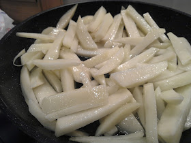 Pelem i fregim les patates, salades però no massa, fins que ens quedin rosses. Les podem tallar com per fer patates rosses (o "palla") o a làmines com si haguéssim de fer truita de patates.